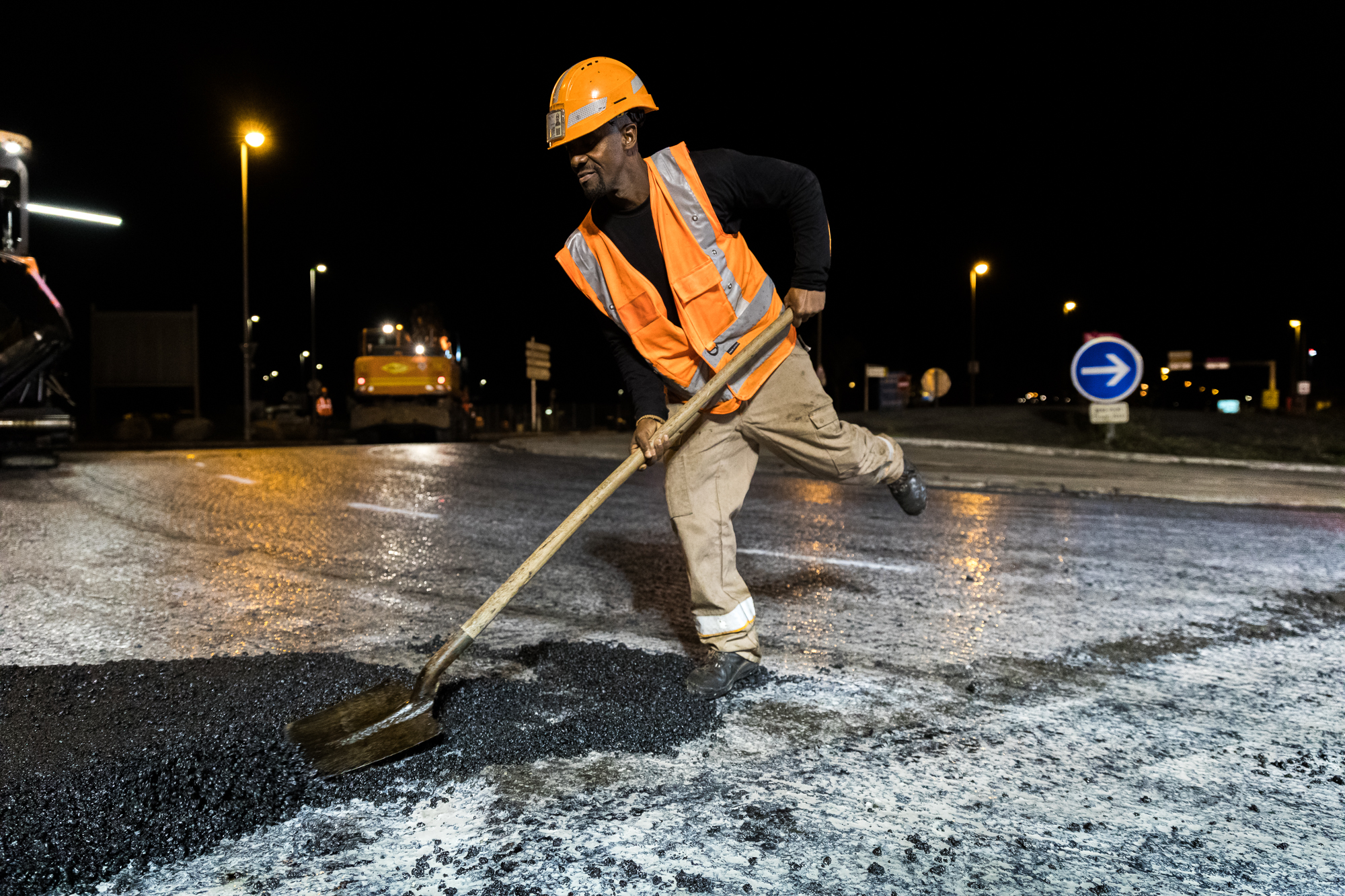Chantier de nuit d’enrobage de voirie place de l’Abbé Cherel à Saint-Herblain.