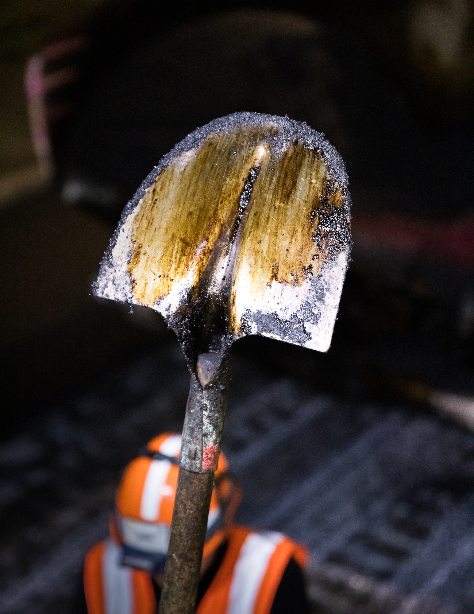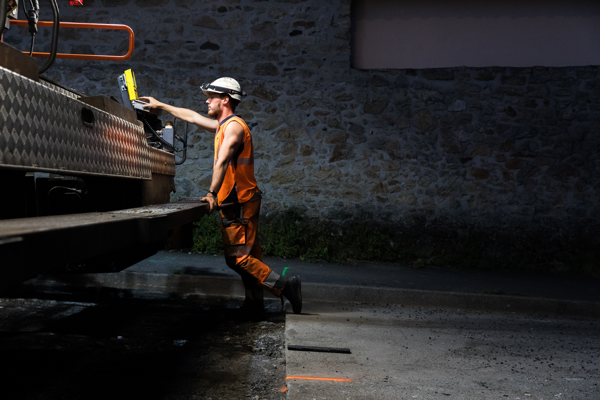 Chantier de nuit d’enrobage de voirie place de l’Abbé Cherel à Saint-Herblain.