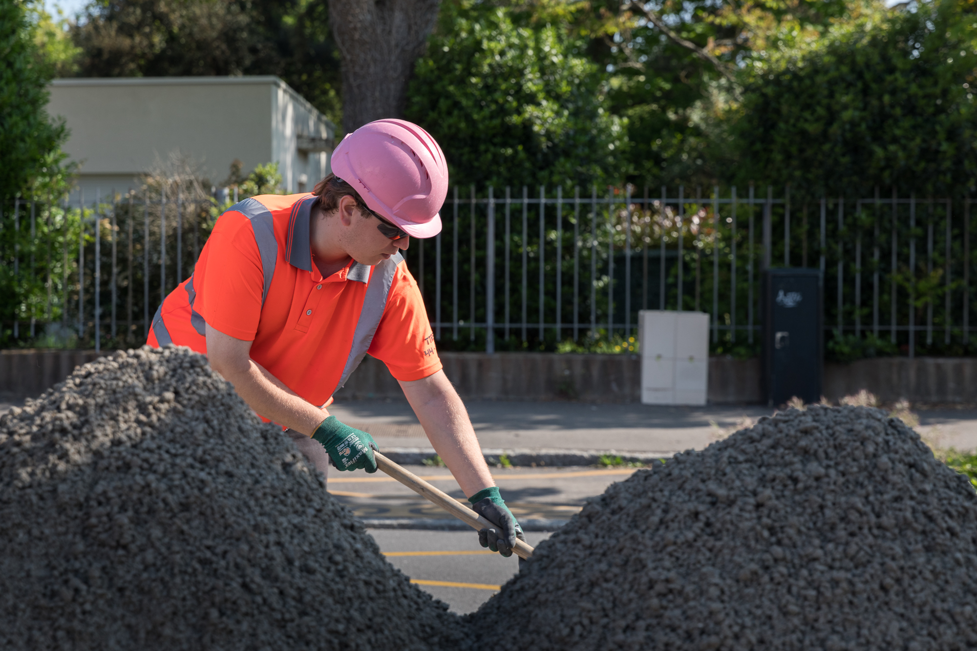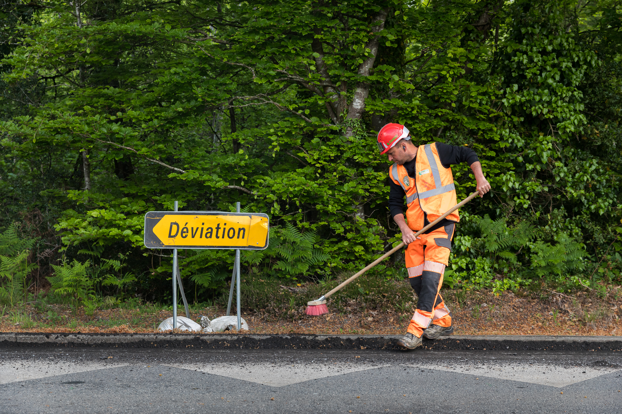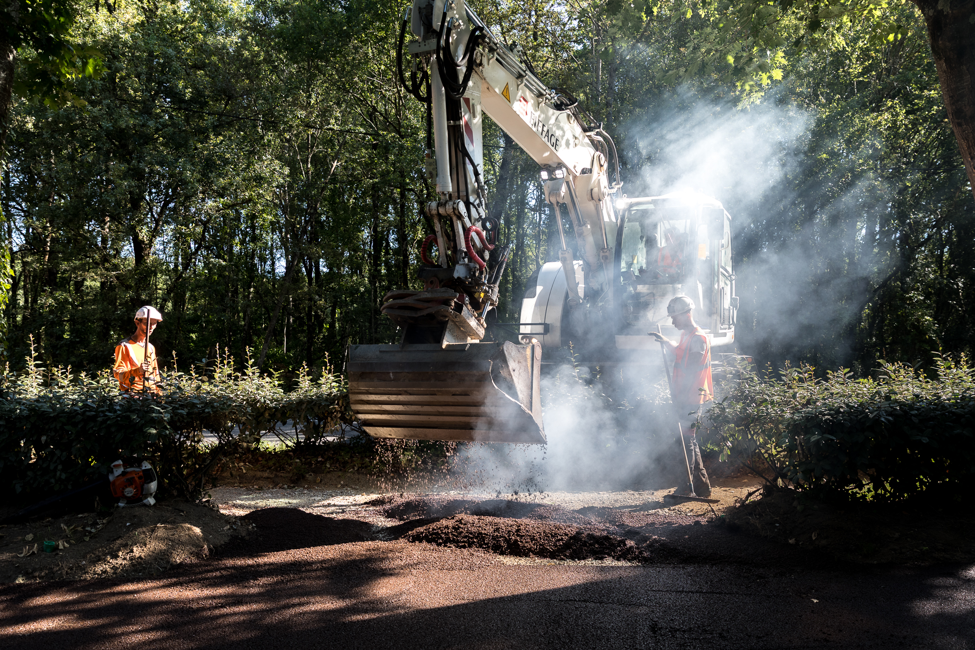 Chantier de mise en place d’un enrobé au liant végétal sur une piste cyclable à Saint-Aignan-Grandlieu.