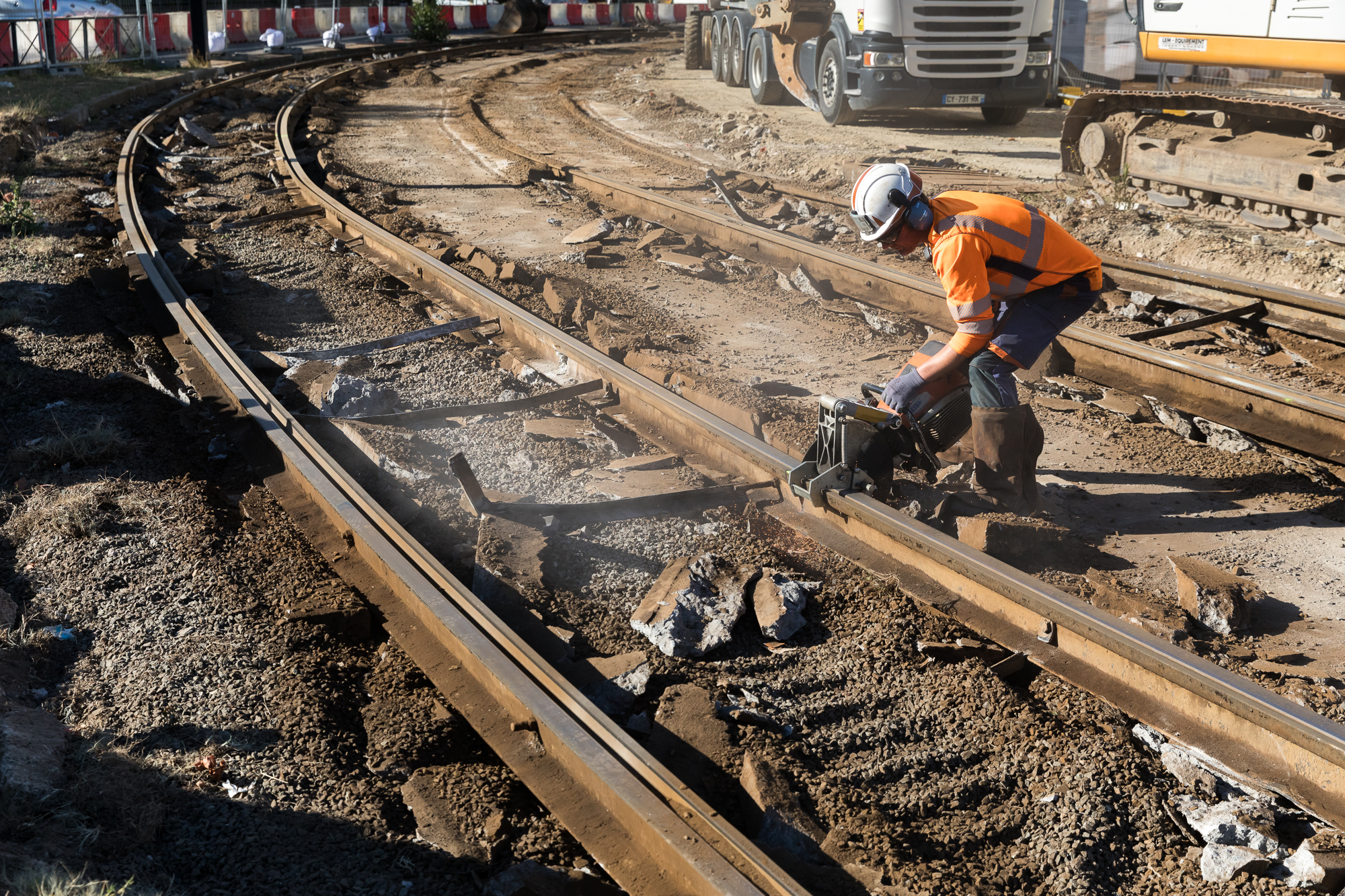 Chantier de démolition et rénovation de voie ferrée dans le quartier de la Beaujoire à Nantes.